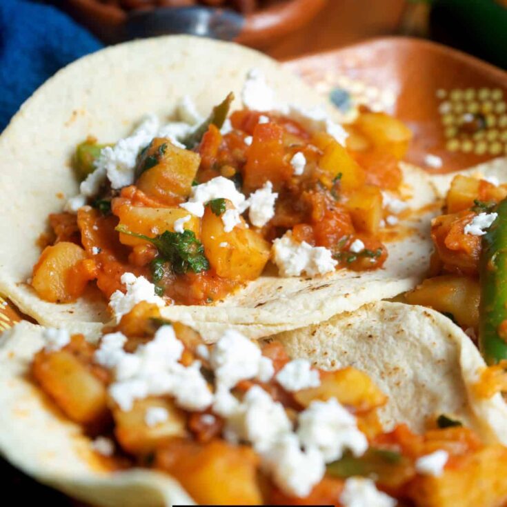 These Potato Tacos (Tacos de Papa) are made by boiling and mashing russet potatoes with sautéed onion, garlic, cumin, salt, and pepper, then spooning the filling into corn tortillas and folding them closed. The tacos are pan-fried till golden and crispy, then topped with classics like lettuce, tomatoes, avocado, salsa, and bitter cream for a crunchy-creamy chunk.